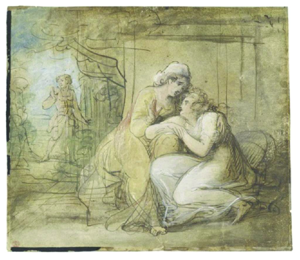 Both Reynolds and Kauffmann attributes are thought to have influenced “The Death of Miss Gardiner” with their sense of modeling and use of light. Cosway extends the practice of contrast between light and dark not only to establish mood, but to draw you in to the painful expression captured on the young subject. The piece was successfully exhibited at the Royal Academy solidifying her proficiency at modeling and depicting strong and realistic transferable emotion to the viewer. Also, an ink, gouache and watercolor sketch that may depict her preliminary studies of the piece survives, showing the time she would spend on studying models poses and expressions as any professional would do. The narratives she commonly paints are fueled by the skill of her depiction of humanity.