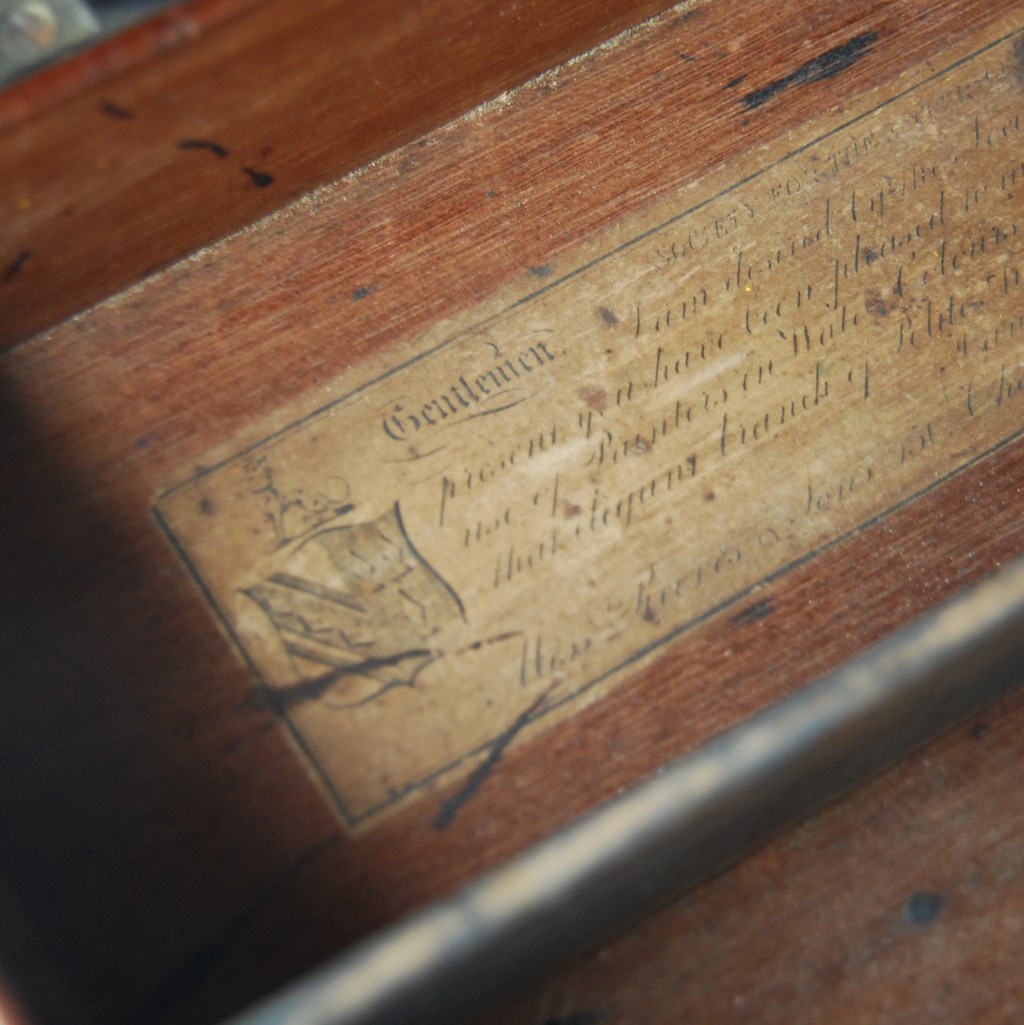 The production of the box is not certain to me. There are two labels inside the box, the top reads a May 17th, 1781, but it is part of a declaration of a society that is difficult to read. The Reeves and Sons lower label suggests an early 19th century date.