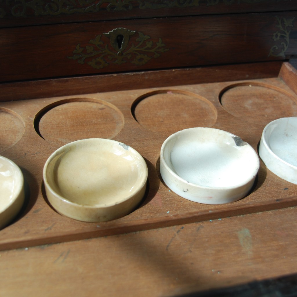 My brass inlaid box, though missing a few parts, and possibly donning a replaced knob, is still a treasured representation of the efficacious portable watercolor box of the later 18th century and early 19th century.
